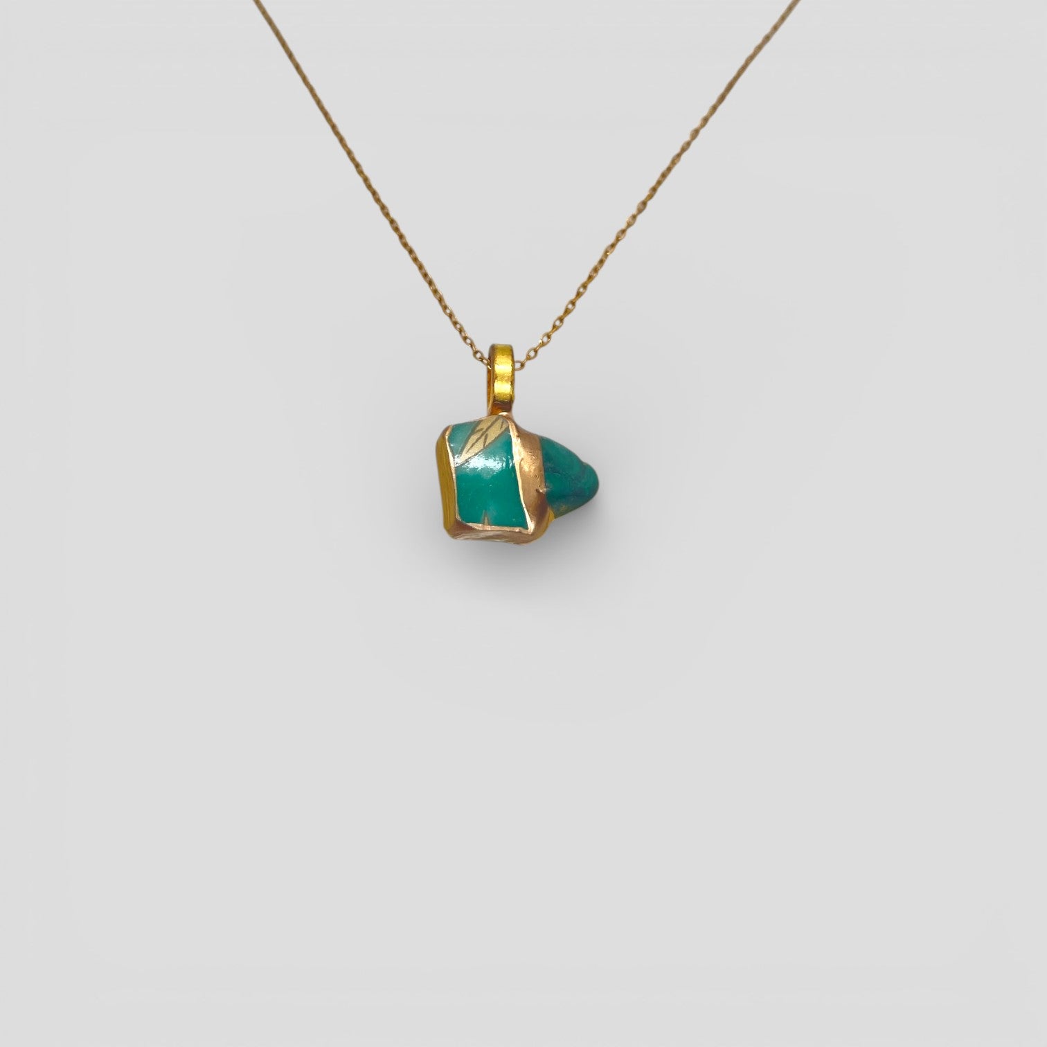 - 14K gold-plated surgical stainless steel (chain) (Metal Allergy-Safe), Brass (pendant hardware). The pendant features brass hardware, which may gently develop a bit of discoloration over time with exposure to sweat or moisture. This natural patina is part of the charm—each piece evolves uniquely and beautifully with wear.