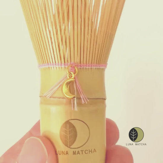 This unique whisk comes with a cute moon-shaped charm, representing the spirit of our LunaMatcha brand, and features delicate pink string wrapping for a charming touch.
